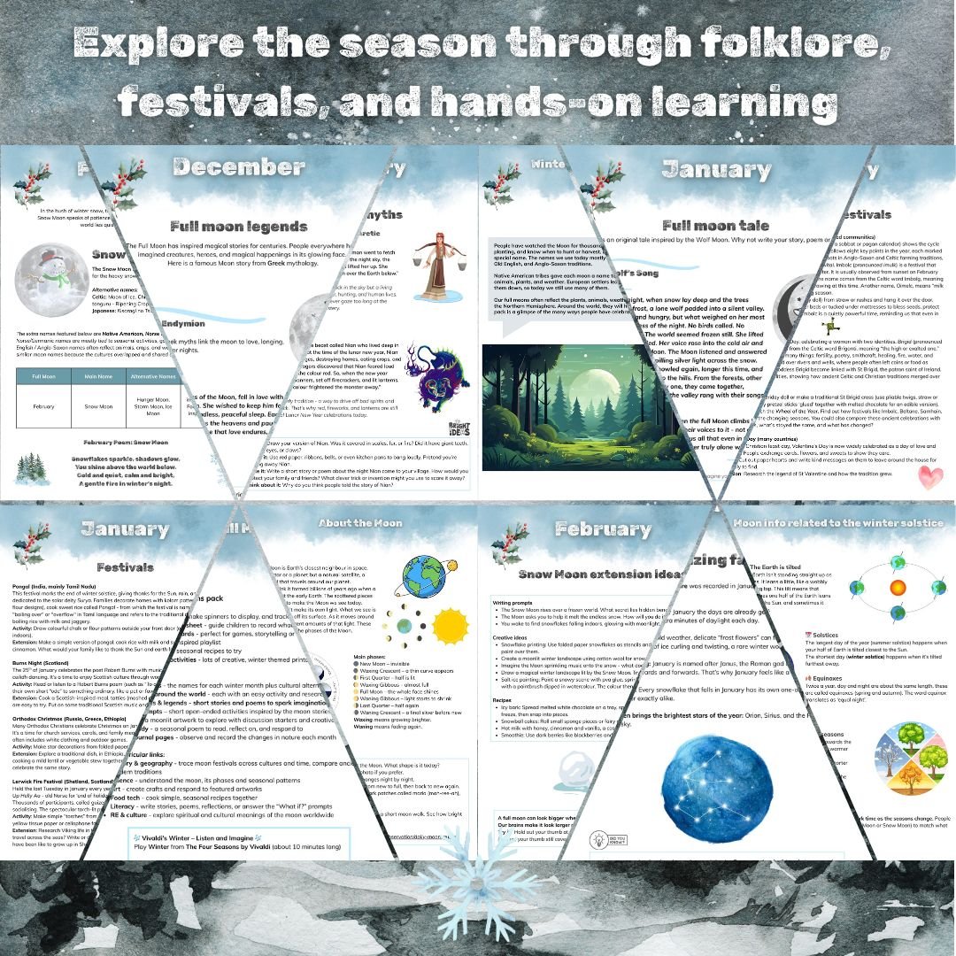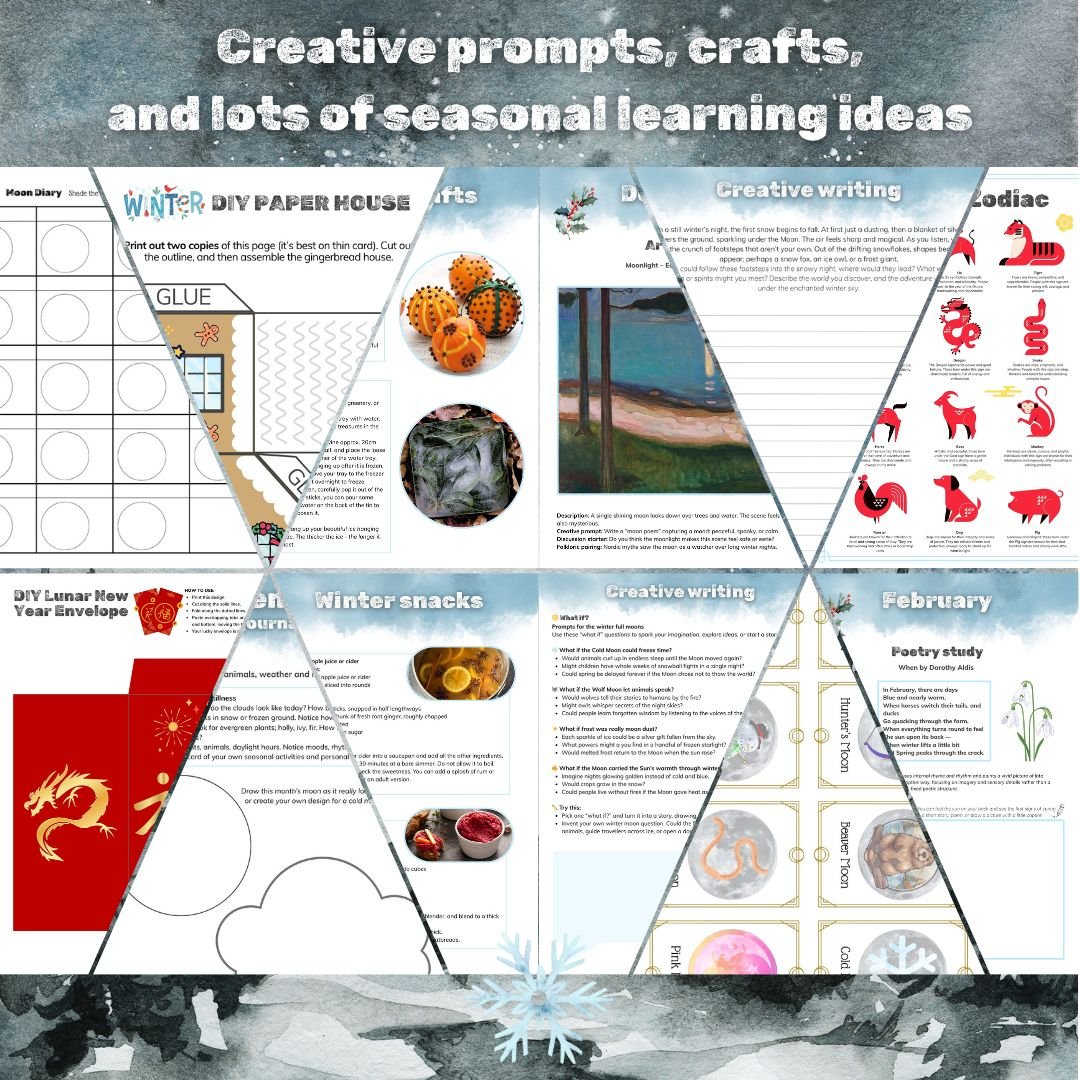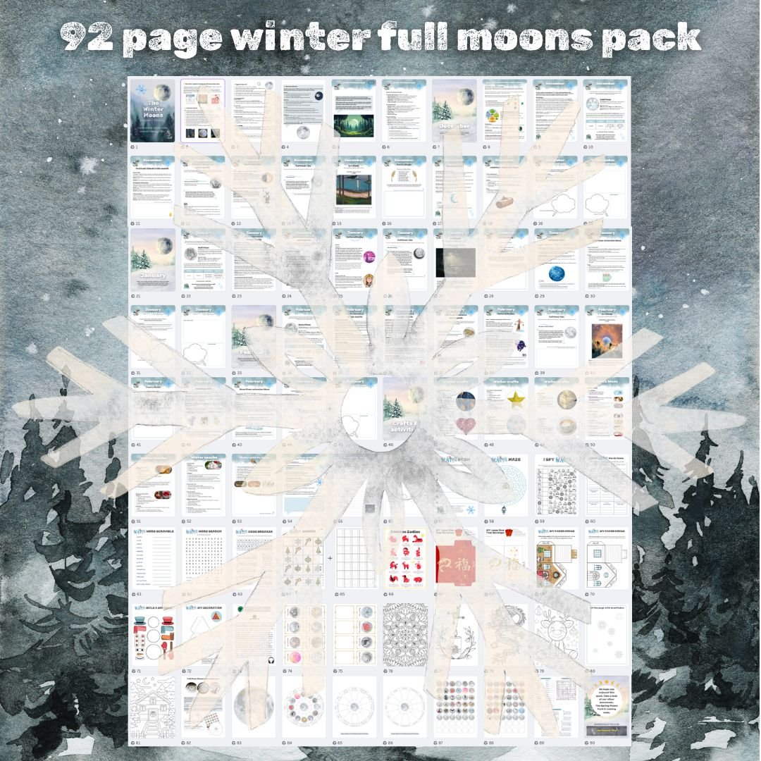 Step into the quiet magic of winter with the Winter Moons Pack. A cross-curricular December to February resource for families who love learning through nature, stories, and creativity. This beautifully designed 92 page pack guides you through the Cold Moon, Wolf Moon, and Snow Moon, weaving together folklore, cultural festivals, art, poetry, and simple crafts and activities. Whether you're diving into a moon study project or following a nature curriculum, this pack offers a rich, reflective way to connect with the season.