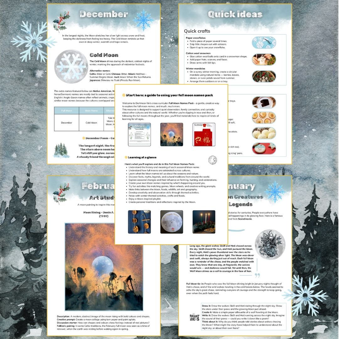 Each Dartmoor Kin download is created with care, and designed to offer something genuinely meaningful and unique. They are not AI written or copied from others, they are a handmade, niche resource created by an independent maker. The packs are created from scratch, inspired by real traditions, the natural world, and years of experience as a designer, writer, and home ed mum. A pack takes many months of work, from research and writing to design and layout. This Winter Moons Pack is a 92 page resource full of stories, folklore, crafts, creative prompts, activities, and cross-curricular learning for all ages. It’s something you can return to year after year, finding new layers of learning and inspiration each time. By choosing this pack, you’re supporting independent creative work and helping keep these kinds of thoughtful, nature-connected resources available to curious families everywhere.